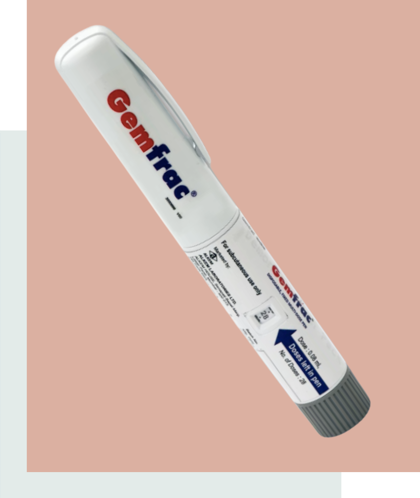 The Gemfrac Delivery Device has enough medicine for 28 days. It is set to give a 20-microgram dose of medicine each day. Keep your Gemfrac Delivery Device in the refrigerator between 36° F to 46° F (2° C to 8° C). Do not freeze the Gemfrac Delivery Device. Do not use Gemfrac if it has been frozen. Do not use Gemfrac after the expiration date printed on the delivery device and packaging. Throw away the Gemfrac Delivery Device after 28 days even if it has medicine in it (see the User Manual).